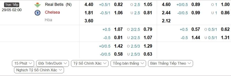 Bảng Tỷ lệ kèo bóng đá Real Betis vs Chelsea