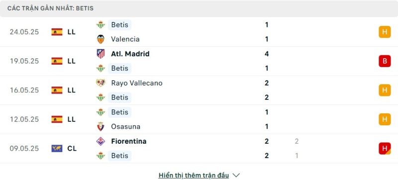 5 trận gần nhất của Real Betis: D-L-D-D-D