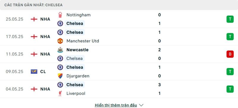5 trận gần nhất của Chelsea: W-W-L-W-W