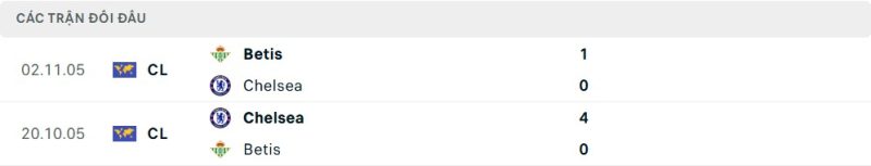 Thành tích đối đầu của Real Betis vs Chelsea