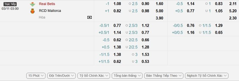 - Kèo tỷ số bóng đá hiệp 1: Real Betis 0-0 Mallorca