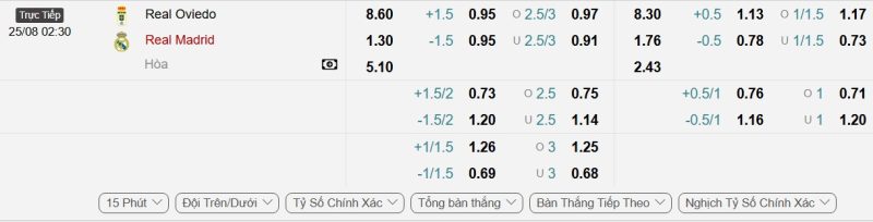 Bảng Tỷ lệ kèo bóng đá Real Oviedo vs Real Madrid