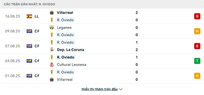 5 trận gần nhất của Real Oviedo: L-D-L-W-D