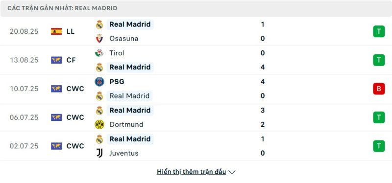 Bên kia chiến tuyến, Real Madrid đã có một màn khởi động mùa giải La Liga 2025/26 thành công bằng chiến thắng tối thiểu 1-0 trước Osasuna. Kết quả này giúp họ tạm đứng ở vị trí thứ 8 và duy trì được đà tâm lý hưng phấn. Trước đó, “Kền kền trắng” đã có một mùa hè đầy sôi động với các trận đấu tại FIFA Club World Cup, nơi họ đã giành những chiến thắng ấn tượng trước các đối thủ mạnh như Juventus và Borussia Dortmund. Với phong độ và lực lượng vượt trội, Real Madrid được kỳ vọng sẽ dễ dàng giành trọn 3 điểm trong chuyến làm khách sắp tới.