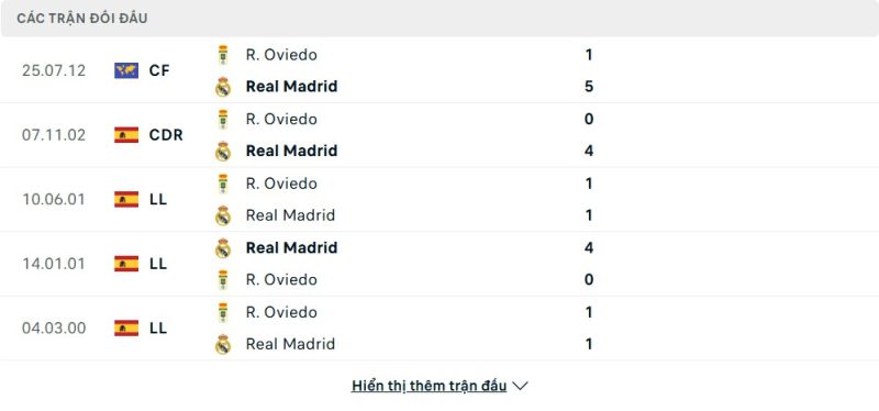 Thành tích đối đầu của Real Oviedo vs Real Madrid