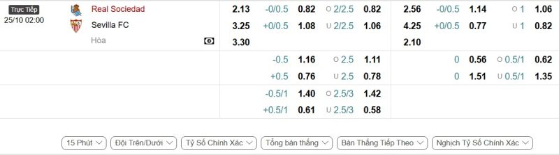 Bảng Tỷ lệ kèo bóng đá Real Sociedad vs Sevilla