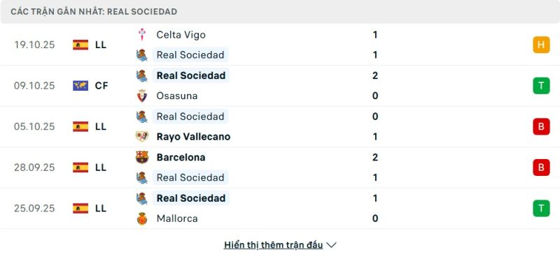 5 trận gần nhất của Real Sociedad: D-W-L-L-W