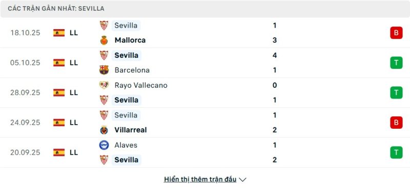 5 trận gần nhất của Sevilla: L-W-W-L-W