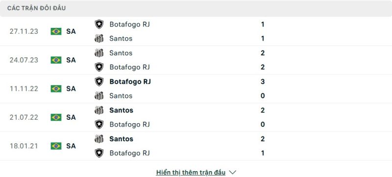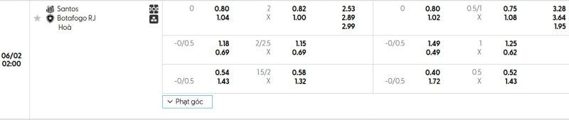 Bảng Tỷ lệ kèo bóng đá Santos vs Botafogo