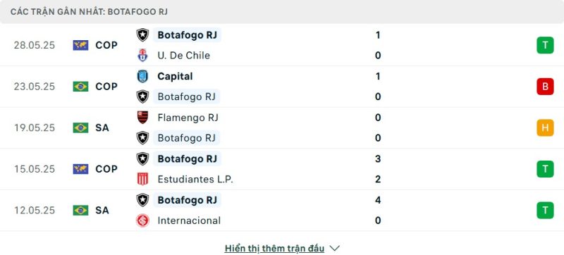 5 trận gần nhất của Botafogo: W-L-D-W-W