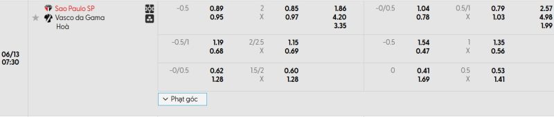 Bảng Tỷ lệ kèo bóng đá São Paulo vs Vasco da Gama