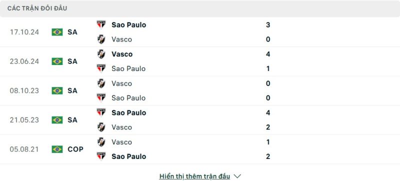 Thành tích đối đầu của São Paulo vs Vasco da Gama