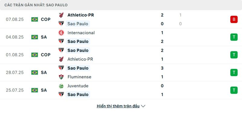 São Paulo đang có phong độ khá ổn định với chuỗi 4 trận bất bại liên tiếp tại giải quốc nội, bao gồm các chiến thắng quan trọng trước Fluminense 3-1, Internacional 2-1 và Juventude 1-0. Dù vừa thua trước Athletico tại cúp quốc gia 0-1, màn trình diễn của họ trong thời gian gần đây cho thấy sự tự tin và hiệu quả trong cả khâu tấn công lẫn phòng ngự. Đặc biệt, khả năng thi đấu trên sân nhà là điểm tựa lớn giúp họ thường xuyên chiếm ưu thế trước các đối thủ.