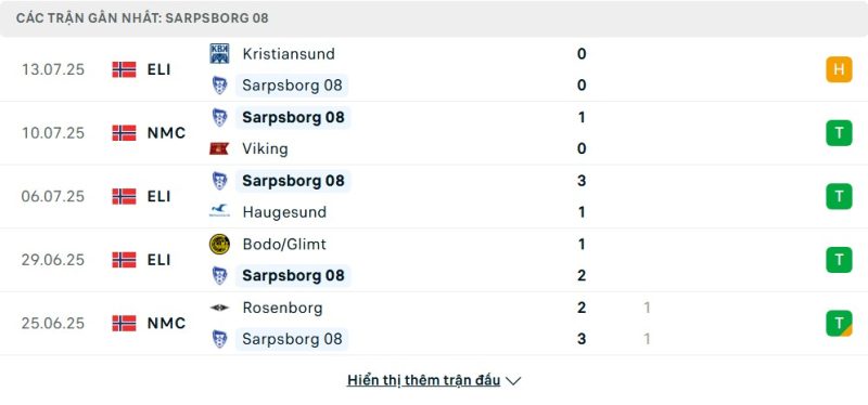 5 trận gần nhất của Sarpsborg: D-W-W-W-D