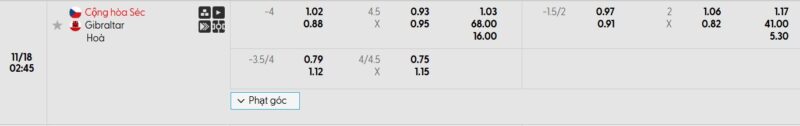 Bảng Tỷ lệ kèo bóng đá Séc vs Gibraltar