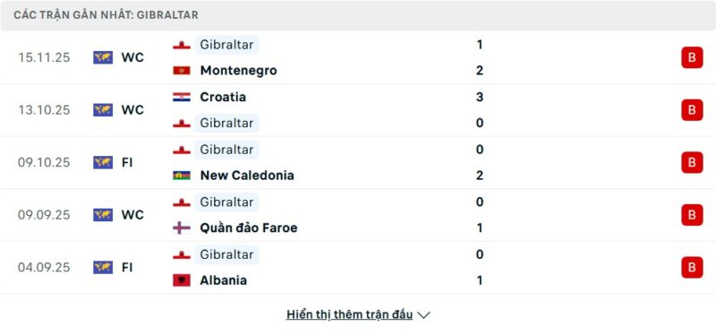 5 trận gần nhất của Gibraltar: L-L-L-L-L