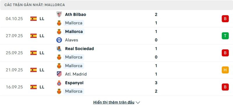 5 trận gần nhất của Mallorca: L-W-L-D-L