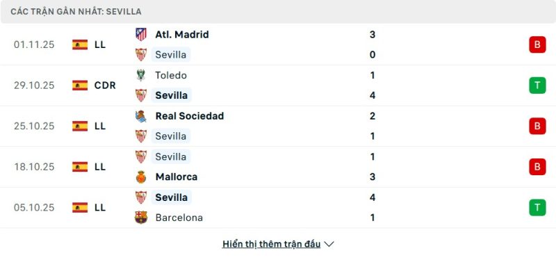 5 trận gần nhất của Sevilla: L-W-L-L-W