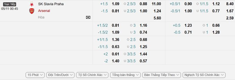 - Kèo tỷ số bóng đá hiệp 1: Slavia Prague 0-1 Arsenal