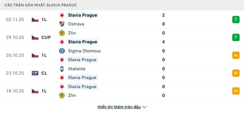 5 trận gần nhất của Slavia Prague: W-W-D-D-D