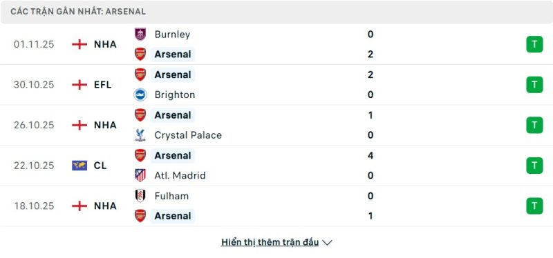 5 trận gần nhất của Arsenal: W-W-W-W-W
