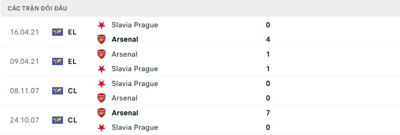 Thành tích đối đầu của Slavia Prague vs Arsenal