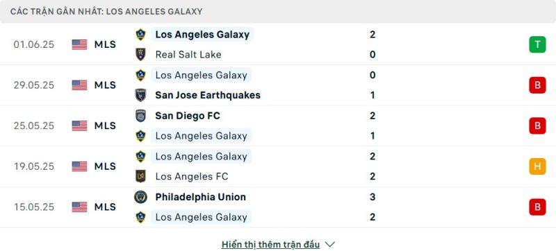 5 trận gần nhất của LA Galaxy: W-L-L-D-L