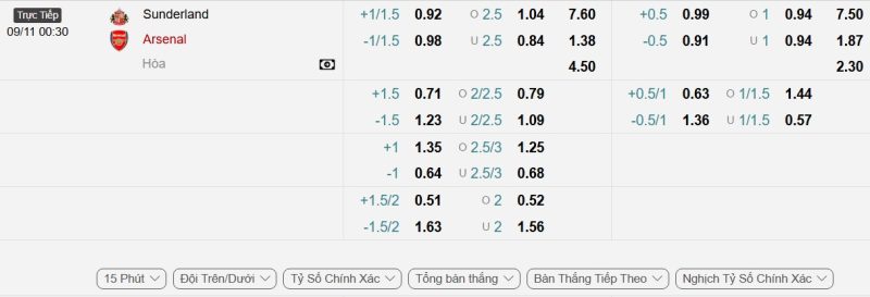 - Kèo tỷ số bóng đá hiệp 1: Sunderland 1-1 Arsenal