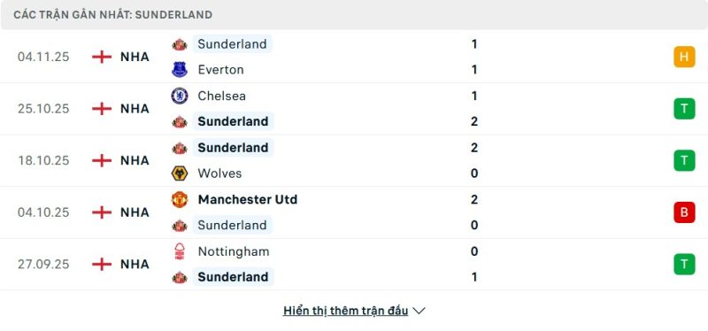 5 trận gần nhất của Sunderland: D-W-W-L-W