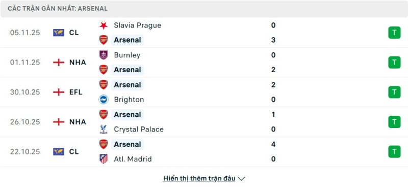 5 trận gần nhất của Arsenal: W-W-W-W-W