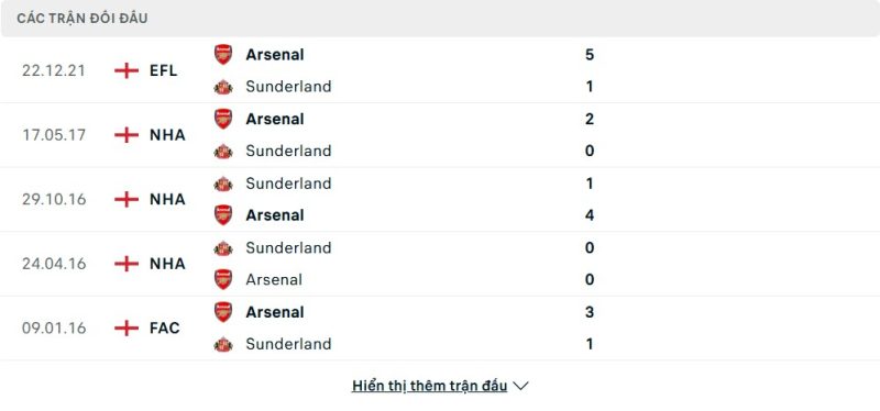 Thành tích đối đầu của Sunderland vs Arsenal