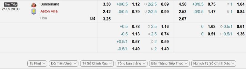 Bảng Tỷ lệ kèo bóng đá Sunderland vs Aston Villa