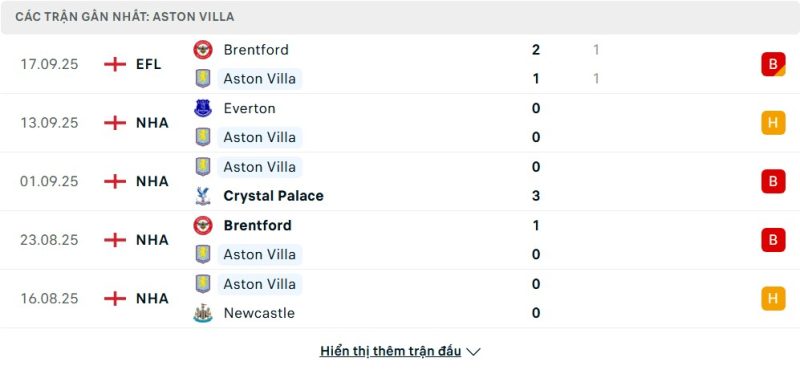 5 trận gần nhất của Aston Villa: D-D-L-L-D