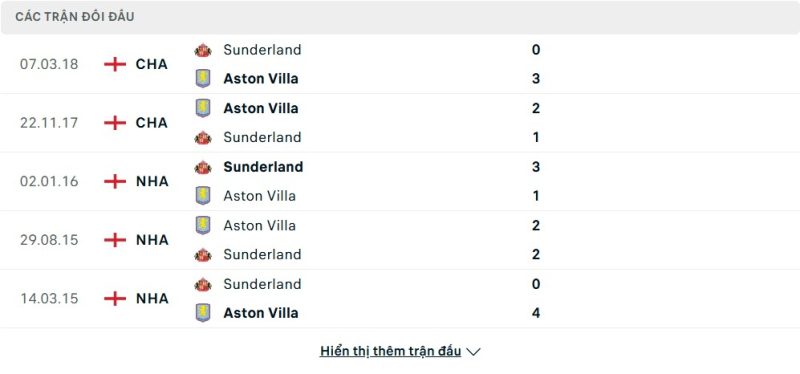 Thành tích đối đầu của Sunderland vs Aston Villa