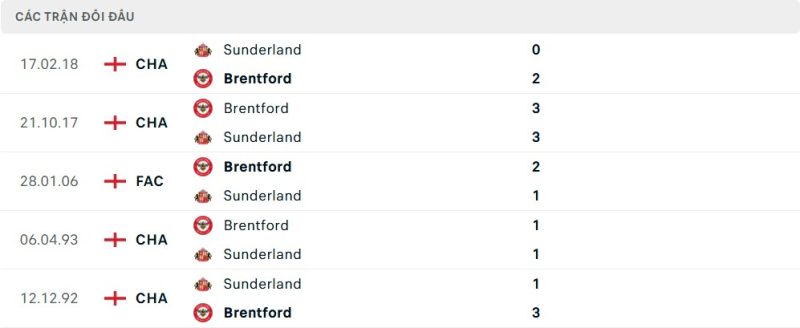 Thống kê phong độ gần đây Sunderland vs Brentford