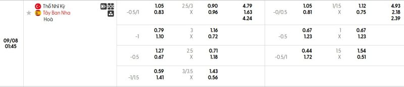 Bảng Tỷ lệ kèo bóng đá Thổ Nhĩ Kỳ vs Tây Ban Nha