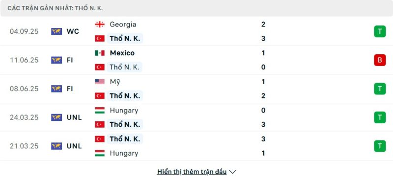 5 trận gần nhất của Thổ Nhĩ Kỳ: W-L-W-W-W