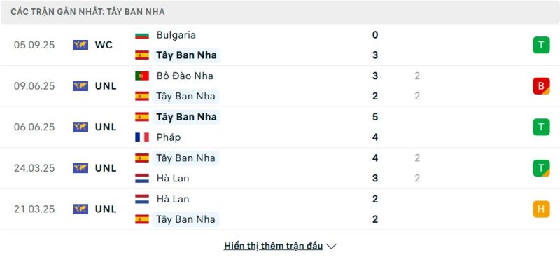 5 trận gần nhất của Tây Ban Nha: W-D-W-D-D