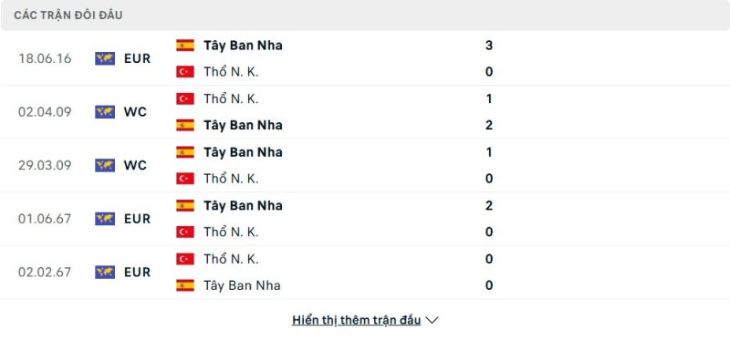 Thành tích đối đầu của Thổ Nhĩ Kỳ vs Tây Ban Nha