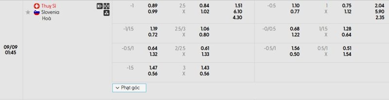 Bảng Tỷ lệ kèo bóng đá Thụy Sĩ vs Slovenia