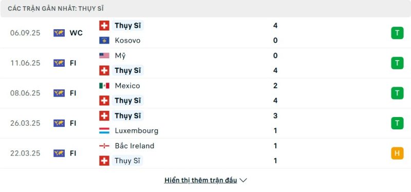 5 trận gần nhất của Thụy Sĩ: W-W-W-W-D