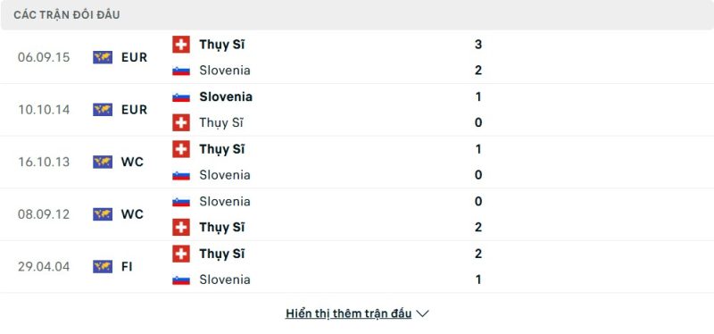 Thành tích đối đầu của Thụy Sĩ vs Slovenia