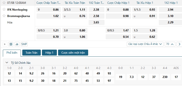 Tip kèo Châu Á full trận IFK Norrkoping vs Brommapojkarna