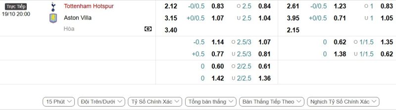 Bảng Tỷ lệ kèo bóng đá Tottenham Hotspur vs Aston Villa