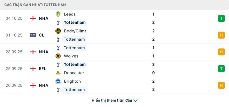 5 trận gần nhất của Tottenham Hotspur: W-D-D-W-D