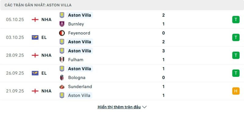 5 trận gần nhất của Aston Villa: W-W-W-W-D