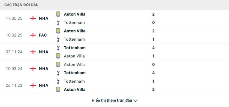 Thành tích đối đầu của Tottenham Hotspur vs Aston Villa