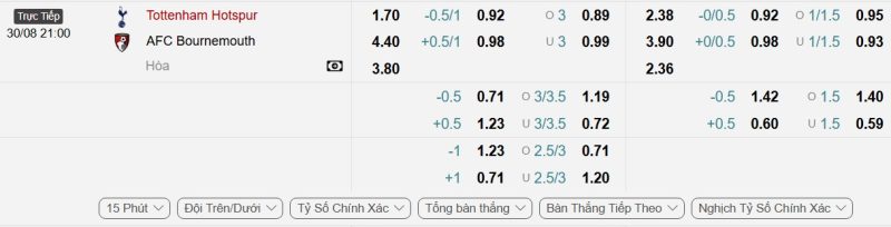 Bảng Tỷ lệ kèo bóng đá Tottenham Hotspur vs Bournemouth