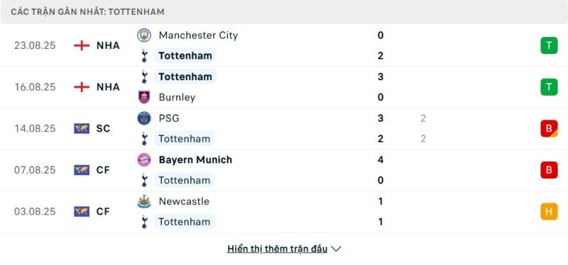 5 trận gần nhất của Tottenham Hotspur: W-W-D-L-D
