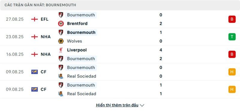 5 trận gần nhất của Bournemouth: L-W-L-D-D